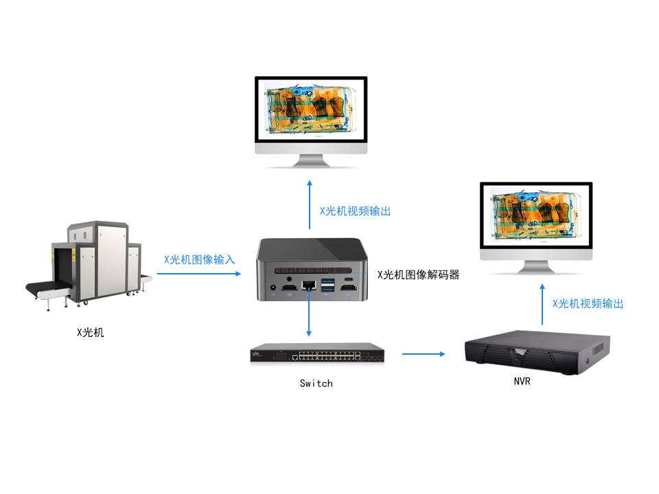 一种通过数字解码技术将X光机输出的HDMI或DVI 数字图像,编码成标准的H.264视频,并可以接入通用NVR做视频录像的装置。本设备可以解码任意格式和刷新率的X光机图像,是机场、火车站、地铁站等公共场所安防系统的必备设备。
